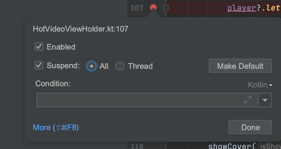 Break point 마우스 우클릭 > suspend : ALL 로 변경